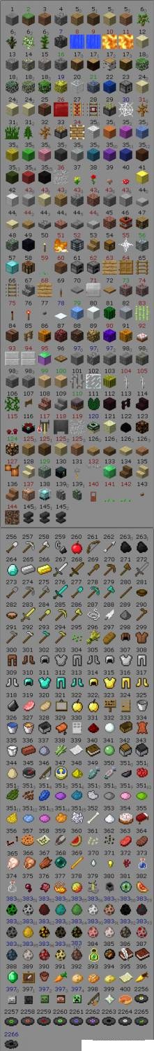 ID предметов Minecraft 1.7.4 это статья очень полезна особенно для новичков и для администраторов майнкрафт серверов. Сегодня я расскажу вам подробно об всех предметах. Вот тут картинка, в которой показаны все предметы и их ИД(идентификатор). Полезная статья, если вам надо выдать себе какую ни будь вещь на сервере, ну или в магазине если хотите что ни будь купить.